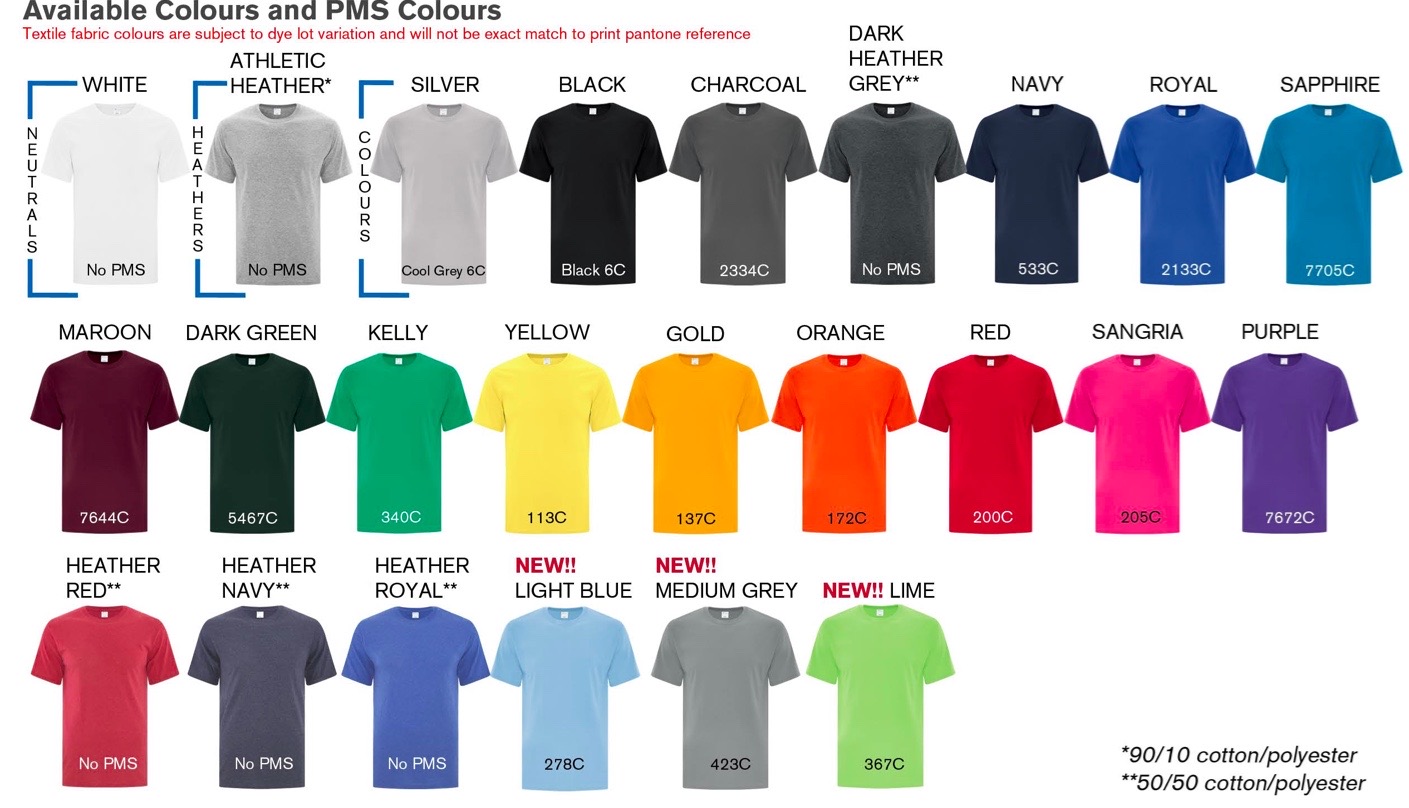 | Adult Shirt Colours | Aquatic Blue, Ash, Athletic Heather*, Black, Bright Aqua, Candy Pink, Caramel, Carolina Blue, Charcoal, Clover Green, Coyote Brown, Dark Chocolate Brown, Dark Green, Dark Heather Gray**, Dark Navy, Dark Sand, Gold, Graphite Heather**, Heather Navy**, Heather Purple**, Heather Red**, Heather Royal**, Kelly, Light Blue, Lime, Maroon, Military Green, Natural, Navy, Neon Blue, Neon Green, Neon Orange, Neon Pink, Neon Yellow, Oatmeal Heather**, Orange, Purple, Red, Royal, Sangria, Sapphire, Steel Blue, Team Purple, True Royal, White, Woodland Brown, Yellow |